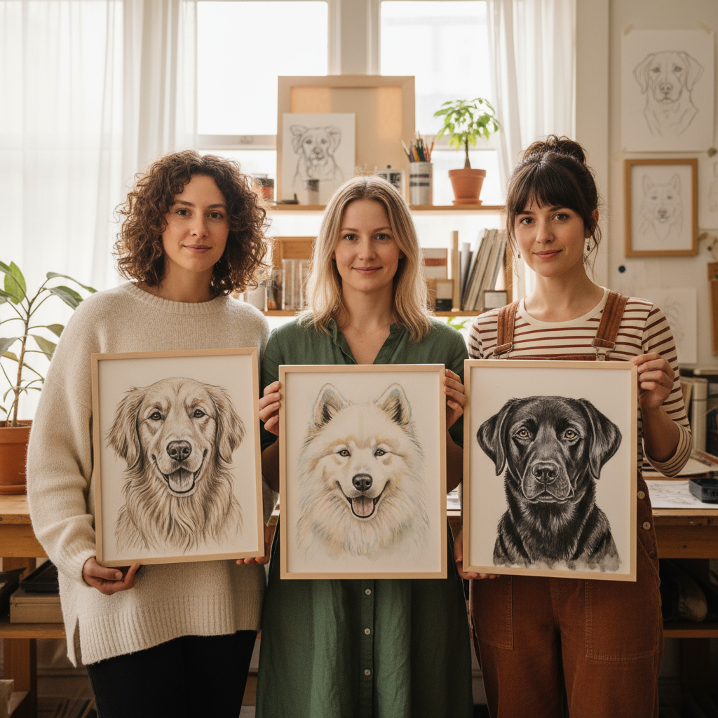 We're a small team of artist friends brought together by our love of drawing and our obsession with animals—especially dogs. What started as sketching pets for fun (and a few happy friends) quickly grew into something more: a way to celebrate the bond between people and their companions.
