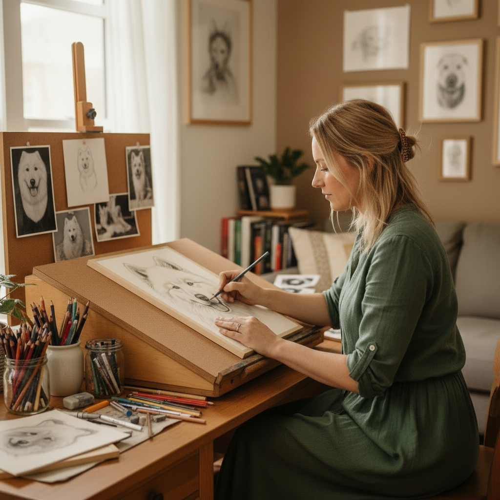 Image suggestion: A close-up photo of one of you sketching at a desk, with pencil in hand, surrounded by pet photos or sketches in progress.